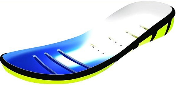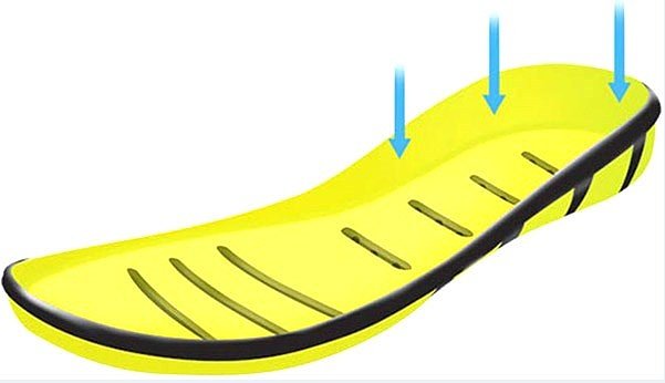 Она практически не имеет вогнутых участков. Это очень важная деталь. Ведь такая геометрия позволяет ноге более плавно переходить с режима удара до отталкивания. Ступня как бы перекатывается с пятки на носок. Это очень удобно и чувствуется на длинных дистанциях. Ноги устают на порядок меньше.